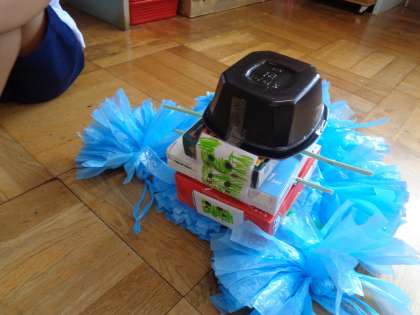 運動遊びも楽しい日々ですが、部屋では「つくってあそぶ」ことも楽しんでいます。いろいろな素材を使って「かめ」をつくり、部屋の中で散歩させて遊んでいます。