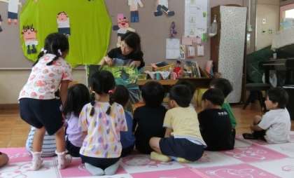 昨日は“わくわくえほんのくに”があり、保護者の方が絵本の読み聞かせをしに来てくださいました。前のめりになりそうなくらいに絵本をじっくりと見たり、絵本の掛け声を子どもたちも真似して言ってみたりして、読み聞かせを楽しんでいました。