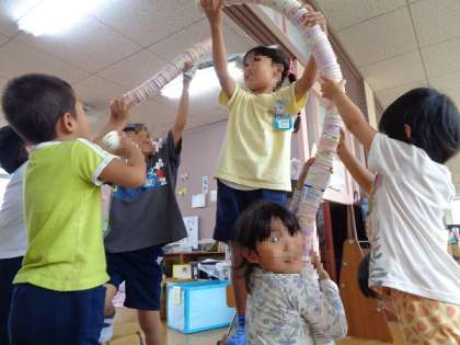 今日は、隣の部屋のゆり組のお姉さんお兄さんが遊びにきてくれ、一緒にヨーグルトやゼリーのカップを積み上げていました。さすが年長さん。友達同士で声を掛け合いながら下で持って支えたり、高く積んだりしている姿がありました。