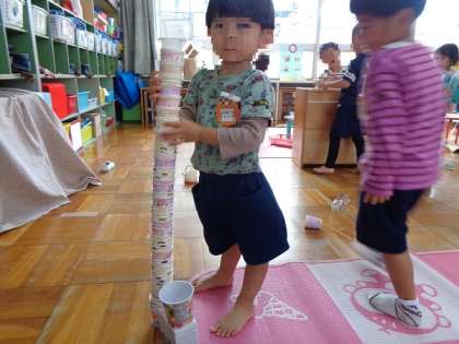 毎日、いろいろな素材を組み合わせて遊んでいる子どもたちですが、中でもカップや箱を積み上げて遊ぶことを、今、特に楽しんでいます。