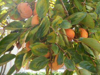 前庭に柿の木があるのですが、緑色の小さな実だったのが、だんだん色付き、今ではいい色、いい大きさの柿になってきました。
