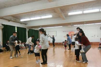 お誕生日のお友達とおうちの人とのふれあい遊びでは、音楽に合わせてトランポリンやボウリングがあるプレイパークに一緒に遊びに行き、手をつないだり、ジャンプをしたりしました。キラキラした笑顔がたくさん見られました♪