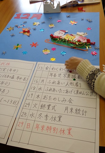 企画委員さんは、委員長を中心に毎月園内に貼り出す行事表を作成してくださっています。「今月はどんな作品にしようかな?」と、皆さん楽しそうに製作を進めておられます。段々とパーツが出来上がり、いよいよ仕上げです!