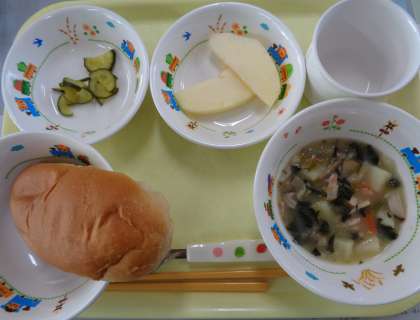 今日の給食は「パン」「鶏肉ときのこのシチュー」「きゅうりのピクルス」「りんご」「牛乳」と、秋が旬の食材がたくさん入ったメニューでした。