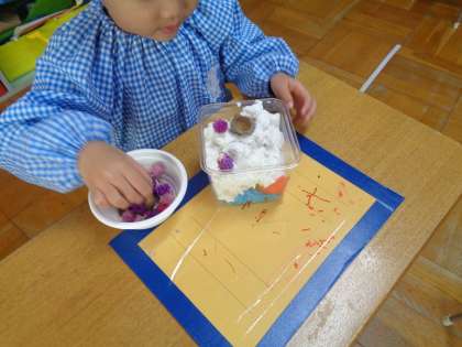 みんなで拾ったどんぐりや木の枝、お花などの自然物を使い、ケーキをつくって遊びました。