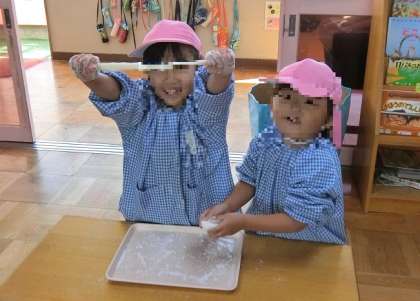 小さくて冷たかったもち米が、温かくふんわりとしたおもちになったのを知り、「見てみて!こんなに伸びるよ!」と丸めたり、伸ばしたりしながら感触を楽しみました。また、年中・年長児は、園長先生が鏡餅をつくるところを見て、「大きいのに、小さいのをのっけるねん!」「めちゃくちゃきれいな丸だね!」と、いろいろな声が聞かれました。