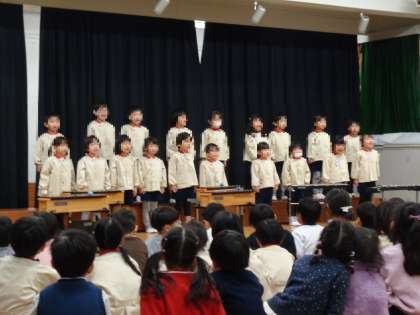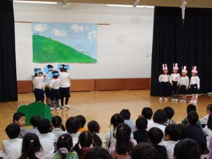 各クラスで楽しんでいる劇遊びや、歌、楽器遊びを他のクラスのお友達と見せ合いっこをしました。他のクラスのお友達や先生に初めて見てもらう子どもたちは、ドキドキしながらも楽しそうに遊んでいました。