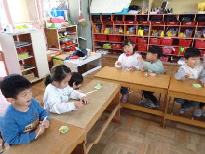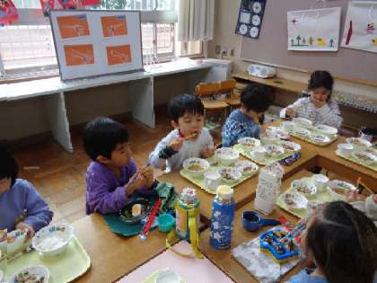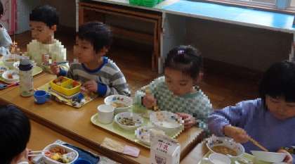 4月当初の給食では初めて見るおかずもあり、ドキドキしているお友達がいっぱいいましたが、今では「おいしい!」と言ってもりもり食べています! 少し苦手なおかずも、お友達と一緒なら頑張れちゃう! そんな姿もありますよ。