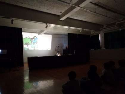 第1部では、PTA活動「わくわくえほんのくに」の保護者の方々が、影絵で『ブレーメンの音楽隊』のお話をしてくださいました♪ OHPを使って遊戯室での壁や天井に影絵が映り、子どもたちはお話の世界にぐっと引き込まれ、集中して見ていました。面白い場面では、みんなで大爆笑!とっても楽しいひとときでした。