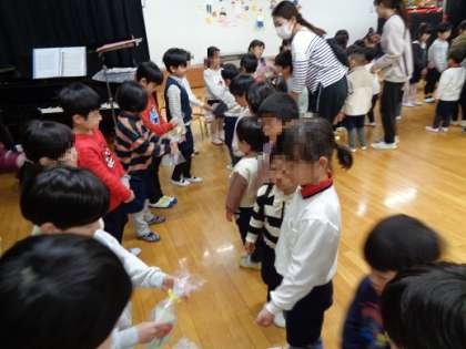 幼稚園での思い出を聞いてみると、楽しかった思い出がたくさん出てきて「一緒に遊んでくれてありがとう」「一緒に手をつないで遠足に行ってくれてありがとう」と、年中少児と年長児がお互いに感謝を伝え合うとても素敵な時間になりました。