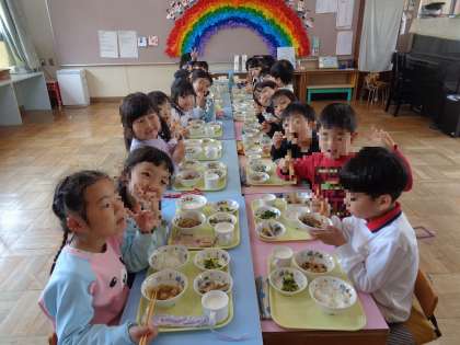 玉造幼稚園のゆり組の部屋で、みんなで一緒に食べる給食最終日は、「最後の晩餐」スタイルに机を並べて食べました。