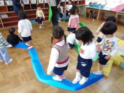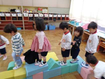 今週はお部屋の中に積み木や平均台で道を作って遊んだり、シール貼りでこいのぼりを作ったりして遊びました。