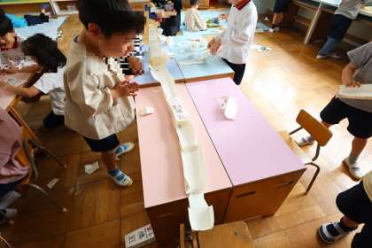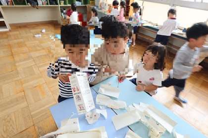 「ビー玉転がしたいねん!」「でも、木のやつ(年中の時に使っていたビー玉転がしの玩具のこと)ないけど…」と、困った顔で教えてくれました。「じゃあ、どうしたらいいかな?」と教師が尋ねると、「つくる!」「転がす装置つくってみる!」という意見があがり、牛乳パックやはさみ、テープを使ってつくることにしました。