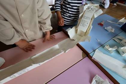 「ちょっとここ持ってて!」「○○くん、テープちぎって!」「椅子で支えたらいいんちゃう?」など、友達と協力してつくり、ビー玉を転がす道ができました。また、順番に何度も転がしながら改良していました。そして、「先生!早く見て!」と嬉しそうに見せに来る子どもたちがとても可愛かったです。
