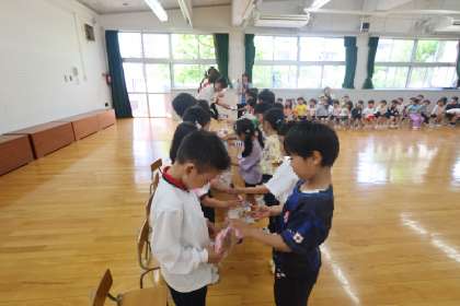 親子でふれあい遊びをし、最後は幼稚園のみんなで『冷凍みかん』の体操をして、楽しい誕生会となりました。
