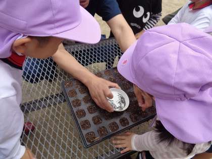 ジニアとマリーゴールドの種を、一つずつ小さなお部屋に分かれたポットに置き、その上から優しく砂のお布団をかけました。「種ちっちゃすぎる!」「何色の花が咲くんかな?」と友達と話をしながら一つ一つ種を植えていました。小さい種が流れないように、底からお水をあげる方法も教えていただきました。どんどん大きくなるように、日々水やりをして生長を子どもたちと見守っていきたいと思います。