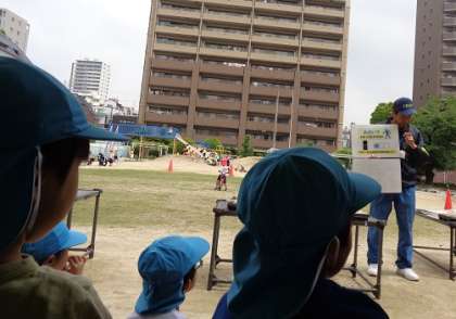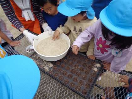 中央区役所の方と地域のボランティアの方に来ていただき、年長児が種花運動に参加しました。