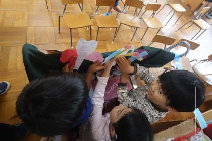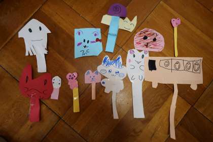 画用紙を使って指人形をつくり、「人形劇するからみにきて!」とクラスの友達、他のクラスの友達や先生を誘い人形劇をしています。