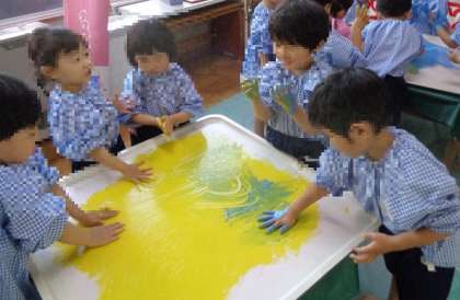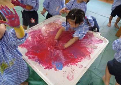 『指絵の具』は筆などを使わず、指や手を使ってかくための絵の具です。大きなプレートに指絵の具を出すと、「触ってみたい…」と思わず触り、「あ!冷たい」「気持ちいい!」「あっちの色もしていい?」「手が紫になった!」と繰り返し何度も楽しんでいました。指絵の具の感触や、色が混ざる面白さ、指で線をかくことなど、それぞれが自分の楽しさを見つけていましたよ。また、遊びましょうね。