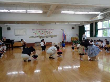 誕生児さんとお家の人で「じしゃくのパワー」、全園児で「ジャングルぐるぐる」を踊ったりして楽しみました♪