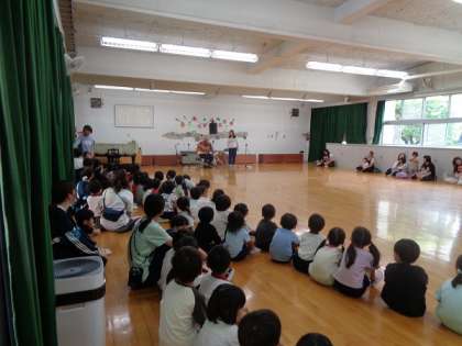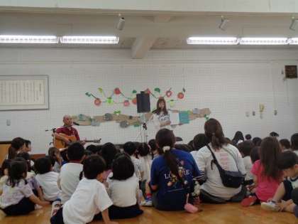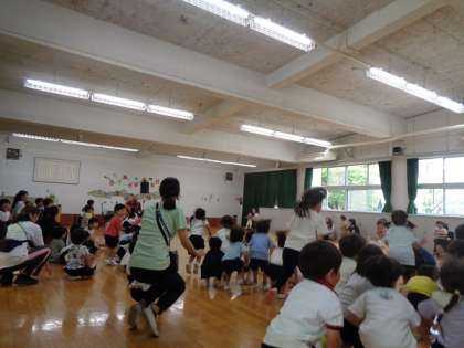 今日は、昨年に引き続き、「まっちゃん」こと町田浩志さんと、服部美幸さんをお迎えして、遊び歌広場を実施しました。未就園児とその保護者の方も一緒に、まっちゃんの素敵なギターと楽しい歌に合わせて歌ったり、踊ったり、ふれあったりし、たくさんの笑い声であふれる時間になりました。
