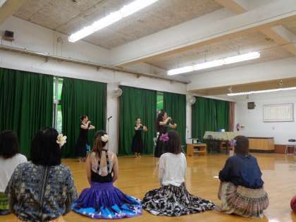 フラダンスグループ「フラ ハーラウ オ アロヒラニ」の先生方に来ていただき、様々なハンドモーションを教えていただきながら、「ラブリーフラハンズ」という曲に合わせて踊りを楽しみました。
