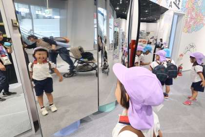 4階に着くと、同じリンゴがありましたが全部重さが違いました。「これすごく重いよ!」と重さ比べをしていました。「この鏡で映ると変な感じ〜!」といろいろ遊ぶコーナーを楽しみました。