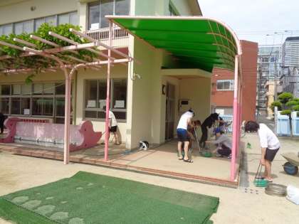 先週の土曜日、PTAの整備委員さんを中心とした保護者有志の方で、プール清掃を実施しました。いよいよ6月末に始まるプール遊びに向けて、子どもたちのためにプールをピカピカにしてくださいました。プールだけでなく、靴箱前のテラスや溝も、人工芝をめくり、埃をかぶりながらもきれいにしていただきました。お手伝いいただいた保護者の皆様には本当に感謝です。
