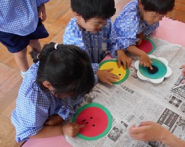 七夕のお話を聞いたり、歌を歌ったりして七夕への期待が高まっている子どもたち。お部屋では、織姫や彦星をつくったり、ビー玉転がしをして短冊に模様をつけたり、お供え物のスイカをつくったり…と、いろいろな笹飾りをつくることを楽しんでいます♪ 持って帰るのが楽しみですね。