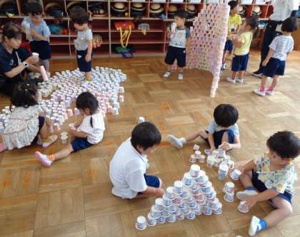 保育室では、好きな遊びのときにヨーグルトのカップで遊ぶことを楽しんでいます。高く積んだり、並べたり、並べた上をそーっと歩いたりして、お友達と一緒に楽しんでいますよ♪