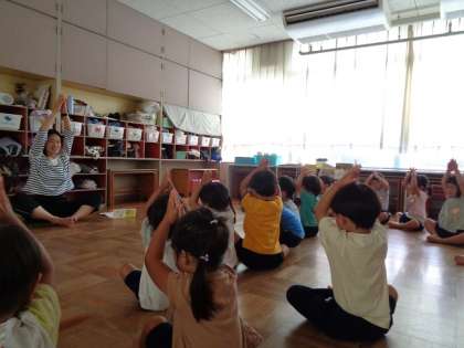 今日はヨガもしてみました。ゆっくりといろいろなポーズをすることは難しかったようですが、真剣な顔で取り組んでいました。