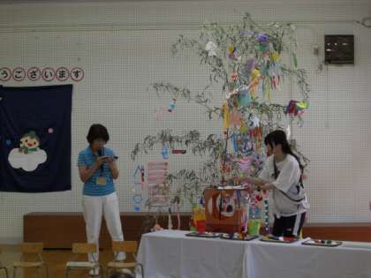 7月の誕生会では、七夕の日が近いので七夕まつりも一緒に行いました。ペープサートの七夕のお話を見たり、園長先生からは七夕のお供え物のお話を聞いたりしました。