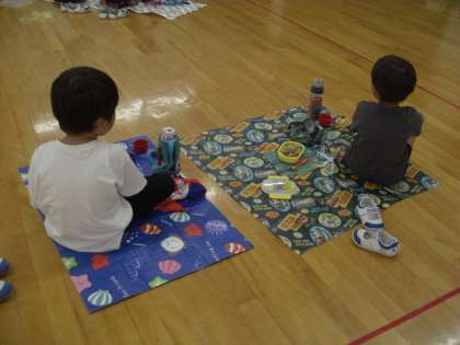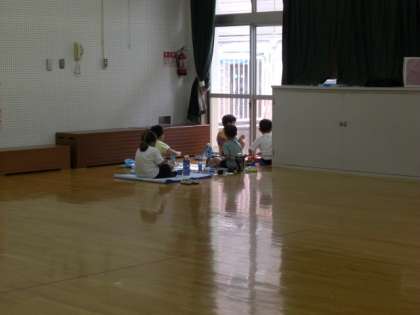 7月に入り、短縮保育になりました。1号認定の子どもたちは預かり保育にお弁当を持って参加します。年少児は椅子に座って机で食べていますが、年中・年長児はお家からレジャーシートを持参して敷いて食べています。
