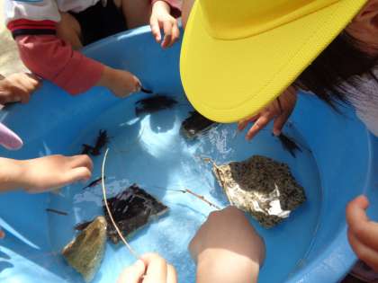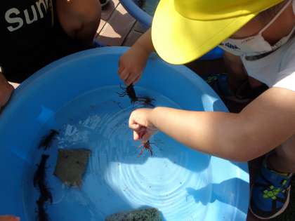 幼稚園にザリガニがやってきました!ザリガニに気づいた子どもたちは興味津々な様子でたらいをのぞいています。「はさみがあるから怖い」と言いながらもツンツンと触ってみたり、持ったりして、たくさん触れ合いました。