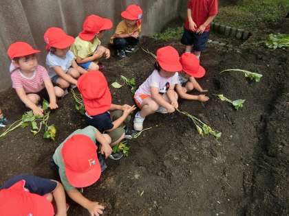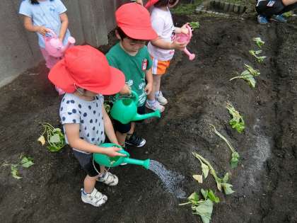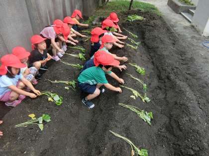 水をあげると「先生、もう さつまいもできた?」とさっそく聞いてきた子どもたち。もう少し涼しくなった秋にできるかな。楽しみですね。