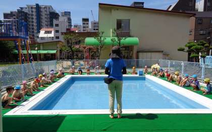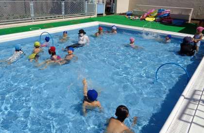 きらきら輝く太陽の下、待ちに待ったプール遊びが6月23日から始まりました。プール開きでは、園長先生のお話や、先生からプールのお約束を聞きました。