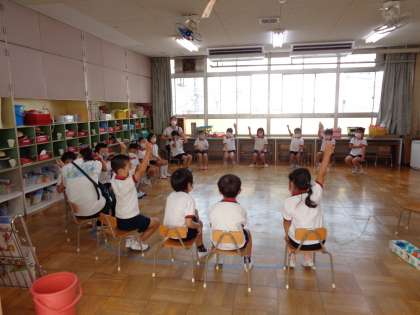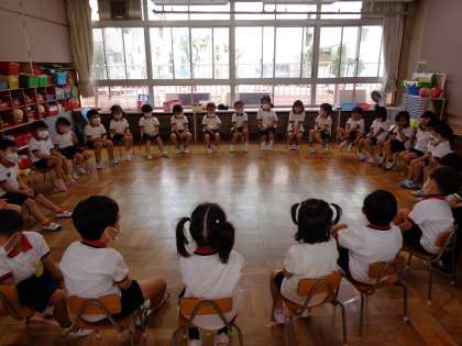 園長先生の「夏休み楽しかったですか?」という質問に、各クラスの保育室から「はーい!」と元気な声がたくさん聞かれました。子どもたちは、夏休みの楽しかったことを各クラスでたくさん話していました。
