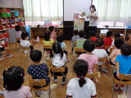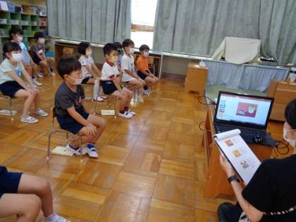 今月の保健指導は「3色食品群」のお話をしました。パワーポイントで「『お肉や魚から生まれたバランスレッド』『ごはんやパンから生まれたバランスイエロー』『野菜や果物から生まれたバランスグリーン』の『バランスレンジャー』が3人揃って、主人公の『ばっかりくん』の体を強くして、バイキンから守る」というお話をしました。詳しくは10月号のほけんだよりでお知らせします。