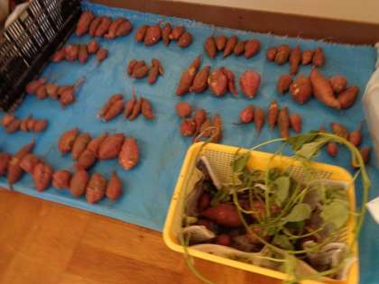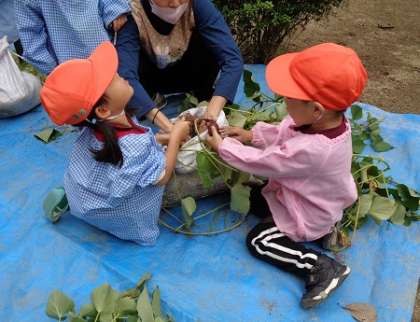 木曜日に幼稚園のみんなで幼稚園で育てたさつまいもを掘りました。長〜いつるの下を掘っていくと紫色のさつまいもが出てきました!つつじクラブのお友達も土嚢袋で育てていたさつまいもを掘りました。長いつるにも興味深々の様子でした。大きなおいもや小さなおいも、いろいろな形のさつまいもが出てきたね!