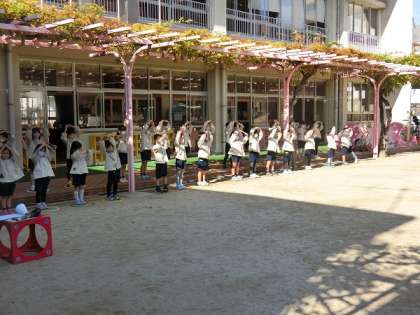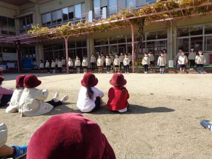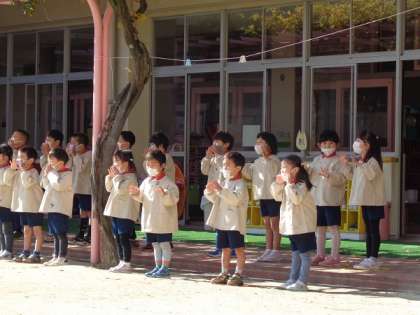 玉造幼稚園の年長児ゆり組・ふじ組は、数園で共有している歌「いちょうのはっぱ」、手遊びをしながら歌う「ころころどんぐりさん」、そして大阪市立幼稚園52園で共有している歌「にじのむこうに」の3曲を園庭で歌いました。