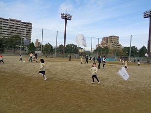 広いグラウンドを思う存分走ったり、風を受けるようにして糸を引っ張ったり、「たこのお散歩♪」と風の向きに合わせて歩いたり、それぞれにたこあげを楽しんでいました。