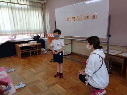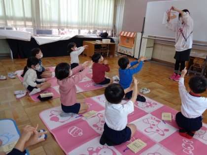 その後、『小学校で保健室に行ったら』を想定し、5種類のケガのカードから1枚選び、先ほど覚えた体の名称を使って「○○組の○○です。○○で○○をケガしました。」と一人ずつ言ってみました。みんな、どこでどんなケガをしてどこが痛いのかを、とてもわかりやすく教えてくれました。小学校にいって、ケガで保健室に行ったときには、幼稚園でした保健指導を思い出して、保健室の先生に伝えることができたらいいなと思います。小学校にいっても、しっかり手洗いうがいをして、早寝早起きをして、毎日元気に過ごしてくださいね。