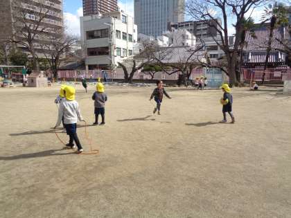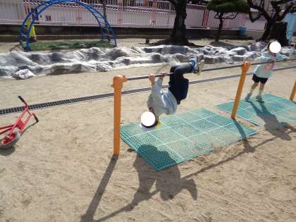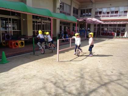 この一年でいろいろな遊びに興味をもったきく組の子どもたち。年長さんの様子を見たり、自分でやってみたいと思ったりして、縄跳びや一輪車、ホッピング、鉄棒など、いろいろな運動遊びに継続して取り組んでいました。時にはうまくいかなくて心が折れそうな姿もありましたが、何度も何度も挑戦していました。