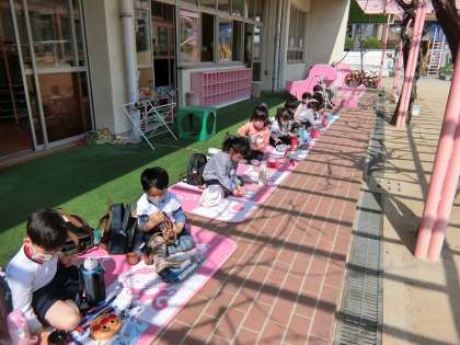 3歳児もも組 お昼ご飯はテラスでピクニック♪
