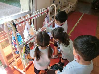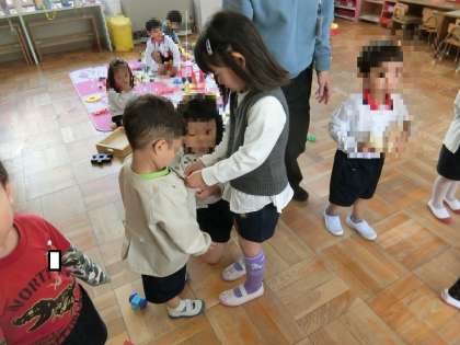 今日は、昨日入園したもも組さんが初めてお家の人と別れて幼稚園で過ごす日です。年長のゆり組さんが朝の身支度のお手伝いに行きました。登園した時から、「今日はももさんのお手伝いやんな!」と嬉しそうにしていたゆり組さん。自分の身支度を素早く済ませ、もも組さんの保育室に向かいました。