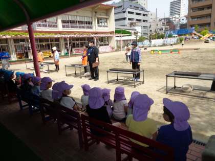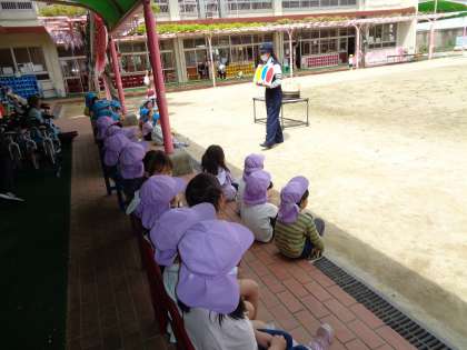 その後は、お巡りさんから交通安全のお話を聞きました。信号や標識・自転車のお話などをしていただき、「赤は止まれやで!」「このマーク知ってる!」と質問に答えながら真剣なまなざしで聞いていました。