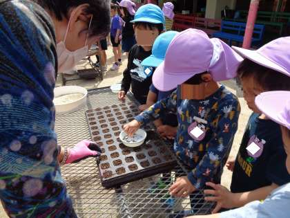 中央区役所の方と地域のボランティアの方に来ていただき、年長児が種花運動に参加しました。マリーゴールドとジニアの種を一つずつ植えて、その上からそーっと砂のお布団をかけました。ポットの下から水をやる方法も教えてもらったので、明日からお世話を頑張りましょうね!