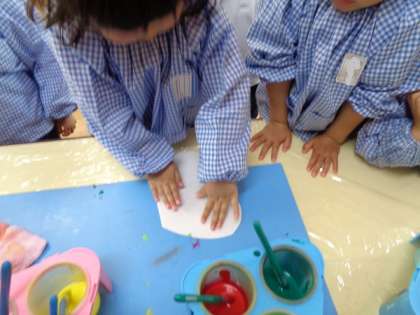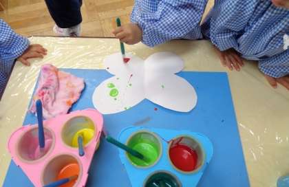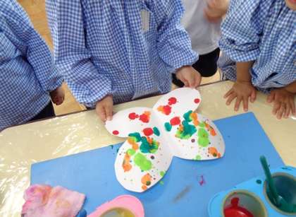 自分のチョウチョだけでなく、友達がどんな色を使ったのかな?どんな模様になるのかな?と興味津々で、絵の具がついてしまいそうなぐらい、覗き込んでいました。