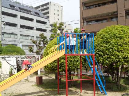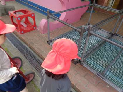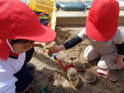 園庭では、滑り台やジャングルジムで遊んだり、砂場でアイスクリーム屋さんをしたり、カメさんを見てお話したり…、それぞれの好きな遊びを楽しんでいます。