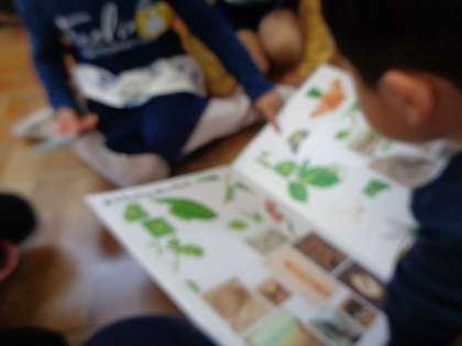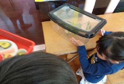 「なんだろう?」「アオムシやで!」「黒いのにアオムシなん?」「??」と不思議そうにしていた4歳児きく組の子どもたち。「どうなるのかな?」と保育室で飼ってみることにしました。そこへ5歳児ふじ組がやってきて、「これ知ってる!」「チョウチョの幼虫やで」と載っている本をもって来てくれました。